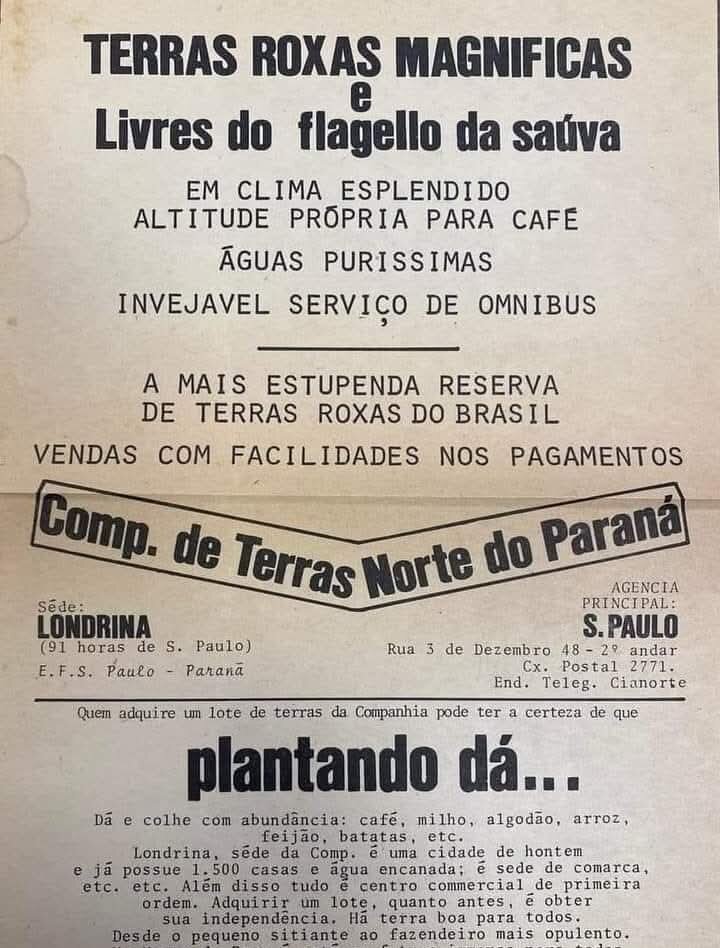 Entre as tipografias carregadas e os superlativos de um panfleto de 1935, impresso no jornal Paraná-Norte, está a síntese publicitária de um projeto de colonização. “Terras roxas magníficas”, dizia o anúncio, com letras garrafais e promessas ainda maiores: livre da “saúva”, com “altitude própria para café”, clima “espl[...] Leia mais
