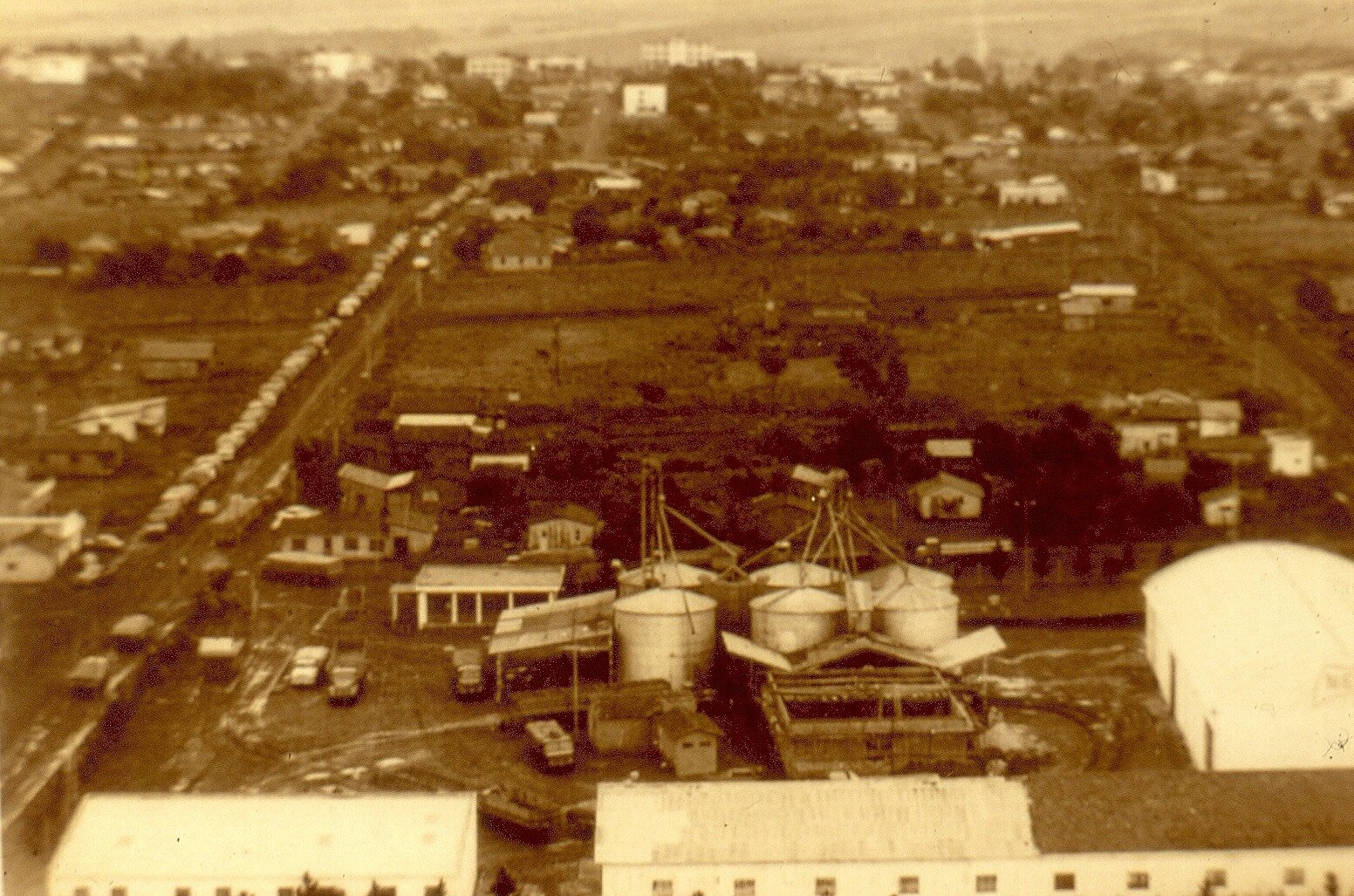 Dos acervos de Xico Tebaldi, o registro mostra os silos da antiga Cerealista Neva, na rua Cuiabá. A empresa foi uma das responsáveis por ajudar nomear o bairro, de mesmo nome. No mesmo registro, de ano desconhecido, é possível observar o Edifício Copal na parte superior.