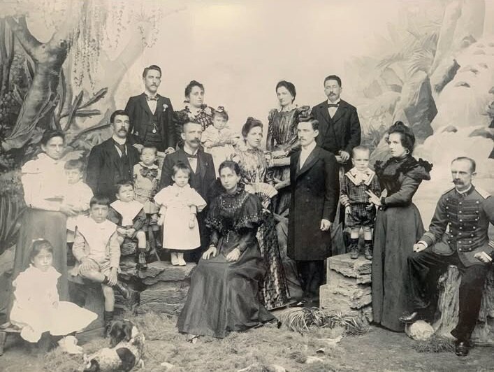A fotografia mostra um grupo familiar posicionado formalmente para o registro, com destaque para a figura central, o Visconde de Nácar. A composição, típica de retratos de família do período, reflete pertencimento a um núcleo social de projeção pública no Paraná.