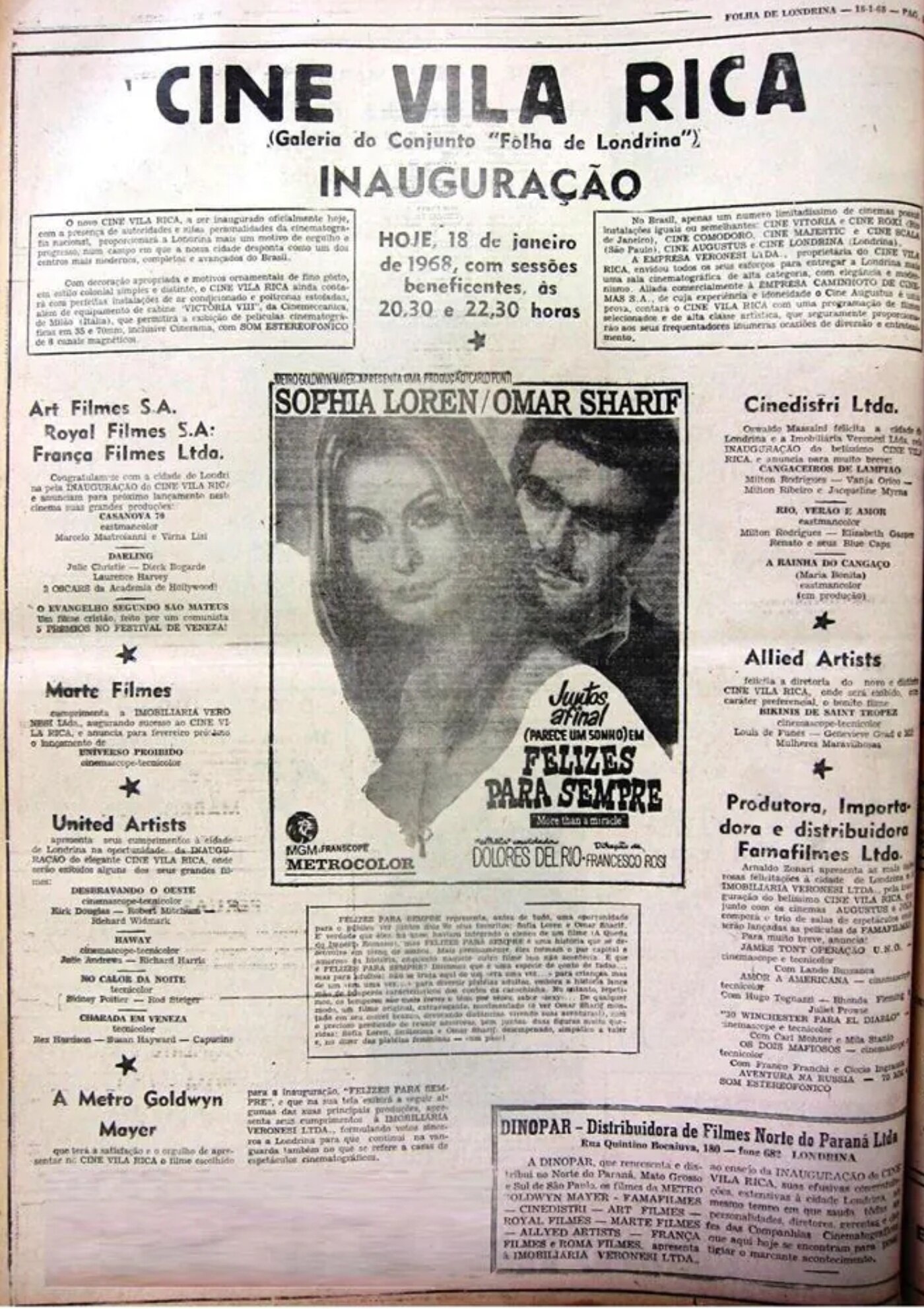 No centro do anúncio, a informação mais objetiva: “Hoje, 18 de janeiro de 1968, com sessões beneficentes, às 20,30 e 22,30 horas”. A estreia, portanto, também contemplava um gesto público e simbólico, associando a abertura da sala a sessões beneficentes. Reforçando a ideia de glamour e expectativa em torno da nova casa de exibição, o centro da página traz o filme escolhido para esse primeiro momento: “Felizes para Sempre”, com Sophia Loren e Omar Sharif.