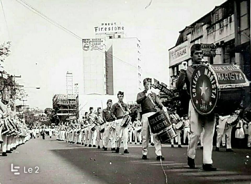 A fotografia mostra a avenida Paraná tomada pelo desfile de Sete de Setembro. Em primeiro plano, avançam os alunos do Colégio Marista, com tambores, estandarte e uniforme alinhado, enquanto o público acompanha a passagem a partir das calçadas. A cena tem a disciplina típica das datas cívicas, mas também registra o centro de Londrina como palco de afirmação urbana. A imagem reúne ritual público, comércio, arquitetura e transformação da paisagem em um mesmo enquadramento.