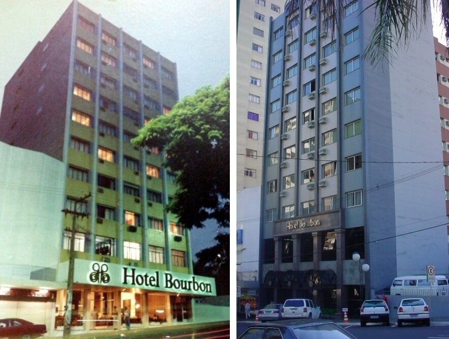 Na imagem, dois momentos do Bourbon Hotel: à esquerda, os anos 1960, e à direita, uma fotografia mais recente.