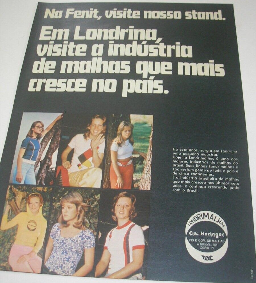 Mais do que um produto, o anúncio apresentava uma posição. “Em Londrina, visite a indústria de malhas que mais cresce no país”, um slogan que afirmava escala e pertencimento num tempo em que a indústria local buscava se coloccar como protagonista nacional.