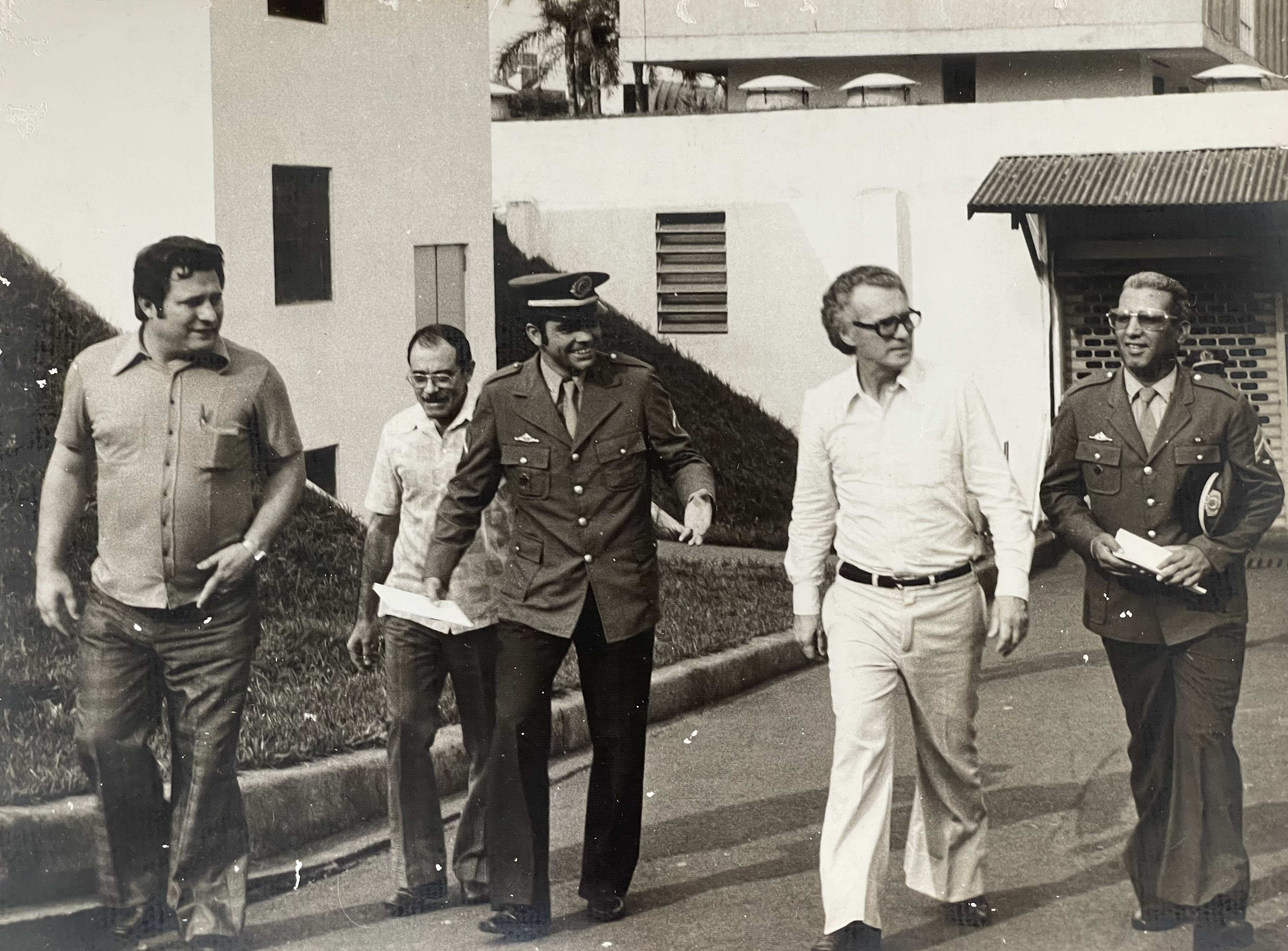 Feita ao longo da década de 1970, a imagem mostra um grupo de autoridades subindo a rampa da garagem do Paço Municipal de Maringá.
