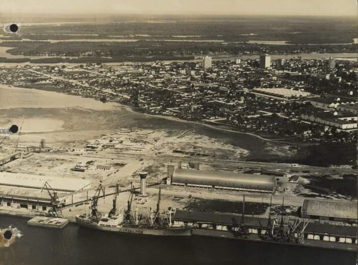 Atualmente tido como um dos mais importantes centros de comércio marítimo do mundo, o Porto Dom Pedro II, na cidade de Paranaguá, foi inaugurado oficialmente no dia 17 de março de 1935. A imagem é de meados da década de 1970 e, de cima, é possível ver, além do porto, o bairro da Costeira, além de uma parte do município de Paranaguá.